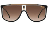 Returning to the origins of the Carrera style, these sunglasses have a bold silhouette with a strong visual impact. The maxi-lenses are the stars, intensified by the colour insert on the flat topline and by the central plaque with the Carrera 'C'. This distinctive model is completed by the metal temples with the lettering logo and contrasting flag